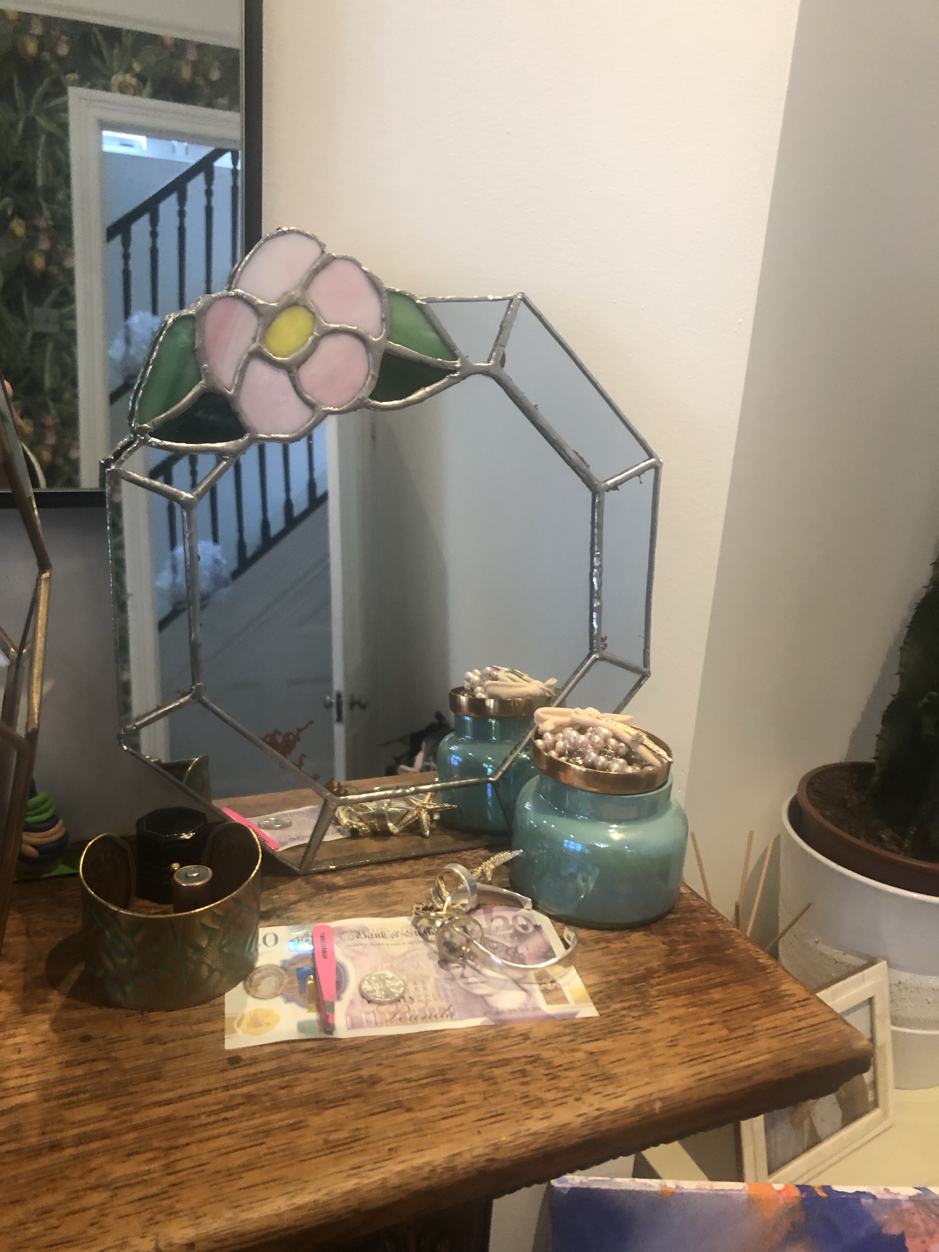 Les cours étaient dispensés par le Club des Remparts et assez rapidement j’ai fabriqué mon 1er objet en vitrail, le miroir ci-contre. Ne regarder pas trop près, c’était toute au début, dans les billets á suivre je vous emmène avec moi dans le découvert de la méthode Tiffany.